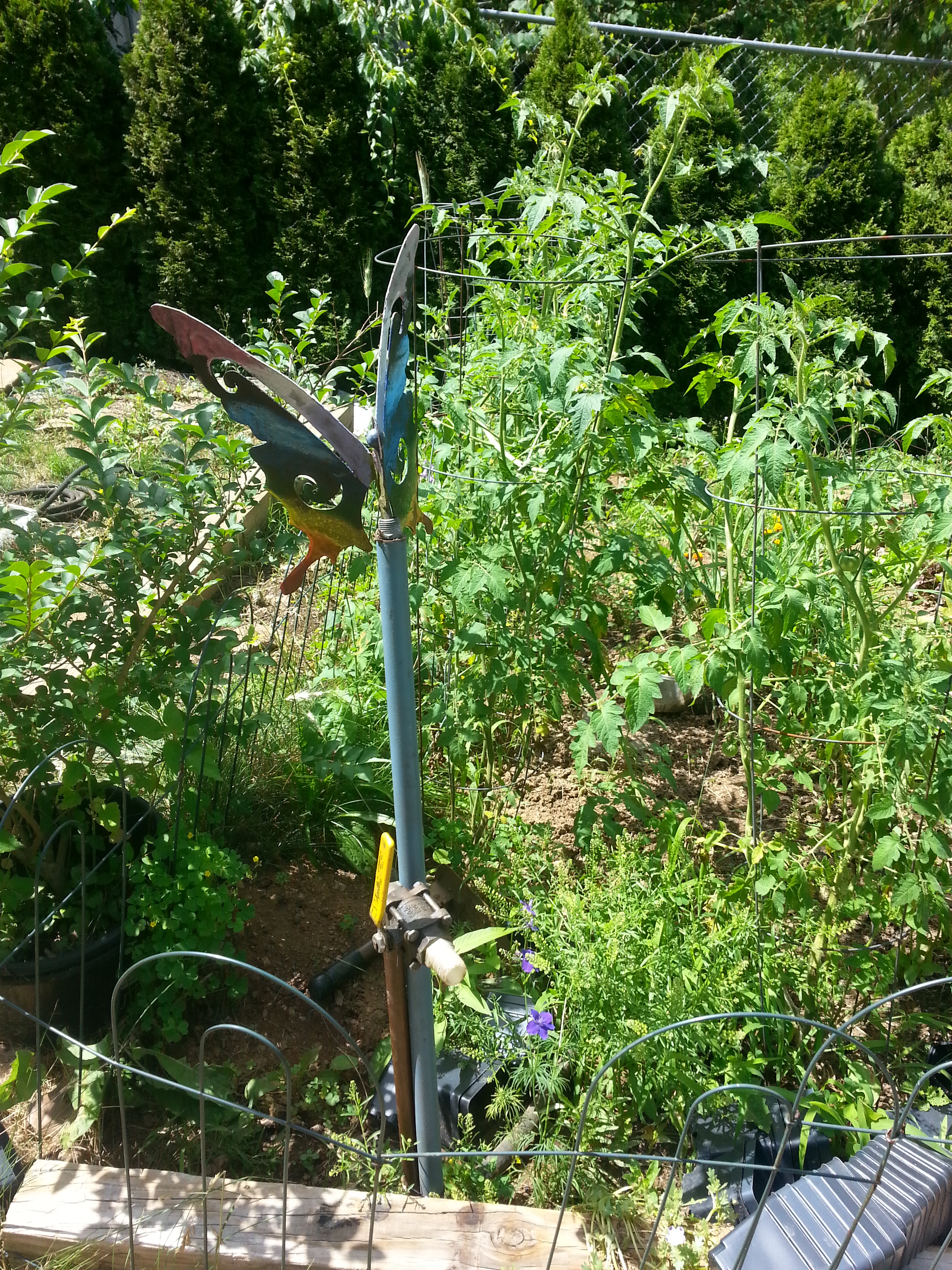 The butterfly on top was an old metal butterfly that I colored using melted crayons. I just used old crayons and a hot gun to melt it on. It is a terrific idea for outdoor coloring, since it does not get affected by rain.