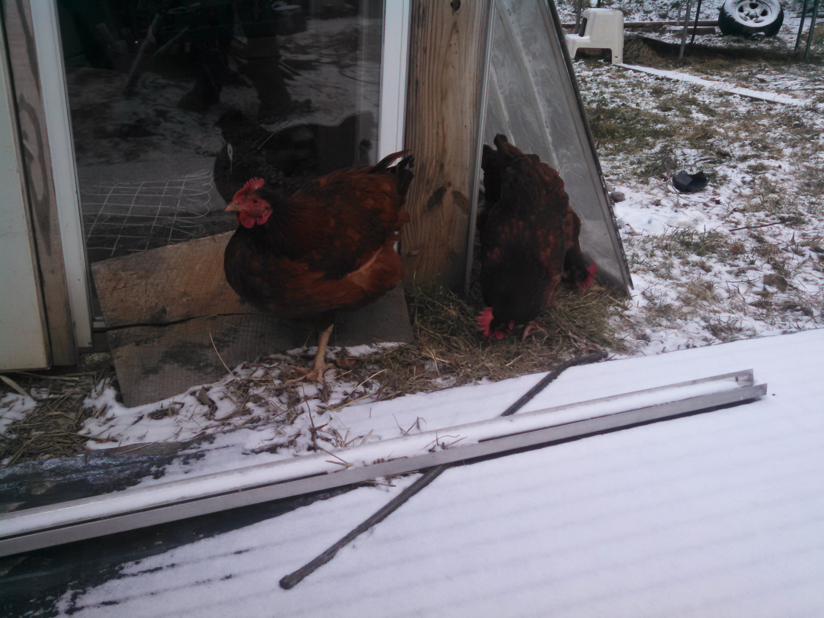 Chickens by the greenhouse