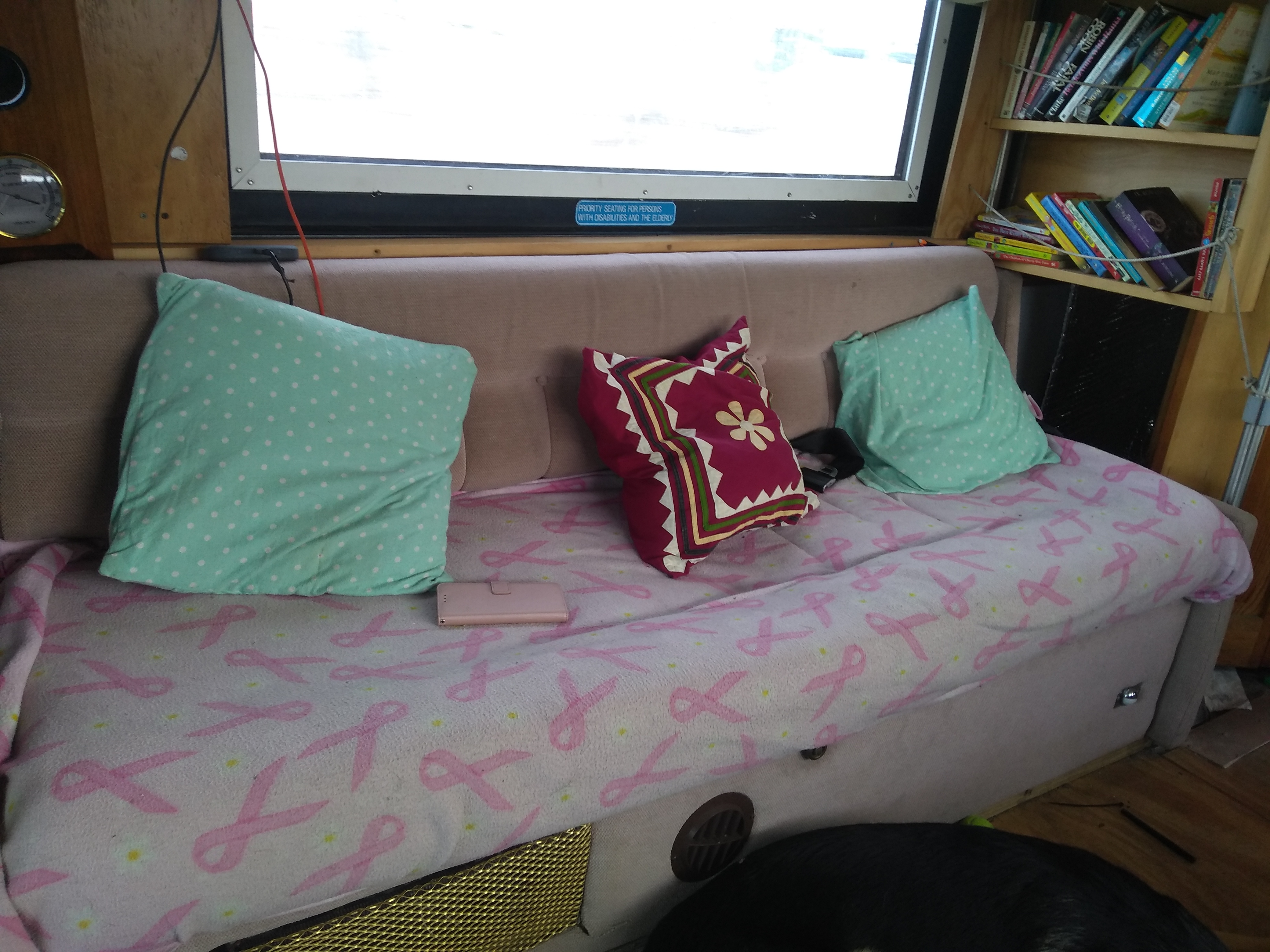 This trip is a lot different from the previous for the following reasons. We towed a jeep along last time. This time we are towing Elfie the school bus. Dory, our giant transit bus camper, is a super trooper, merrily towing along Elfie. The second big deviation is that we now have two dogs to stub our toes in the bus instead of one. Where are these staid dogs they often show in ads that lay around blissfully in moving vehicles? Our dogs are constantly whining, pushing, falling, fighting and doing pretty much the opposite of what dogs are “supposed” to do!