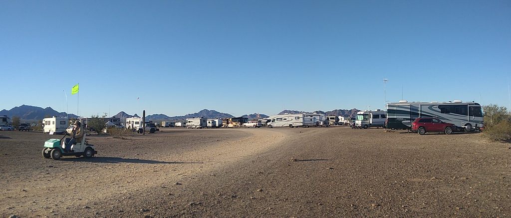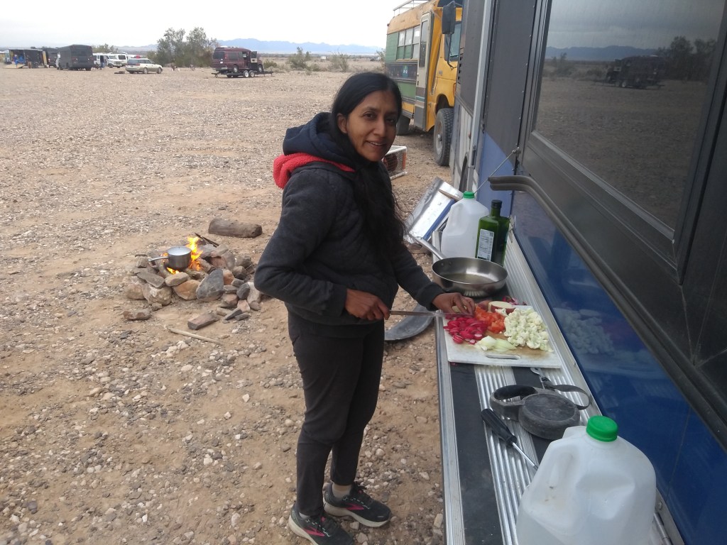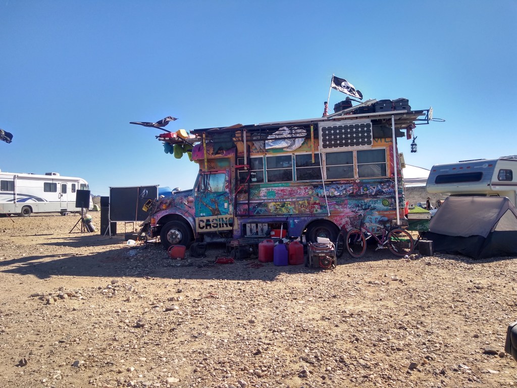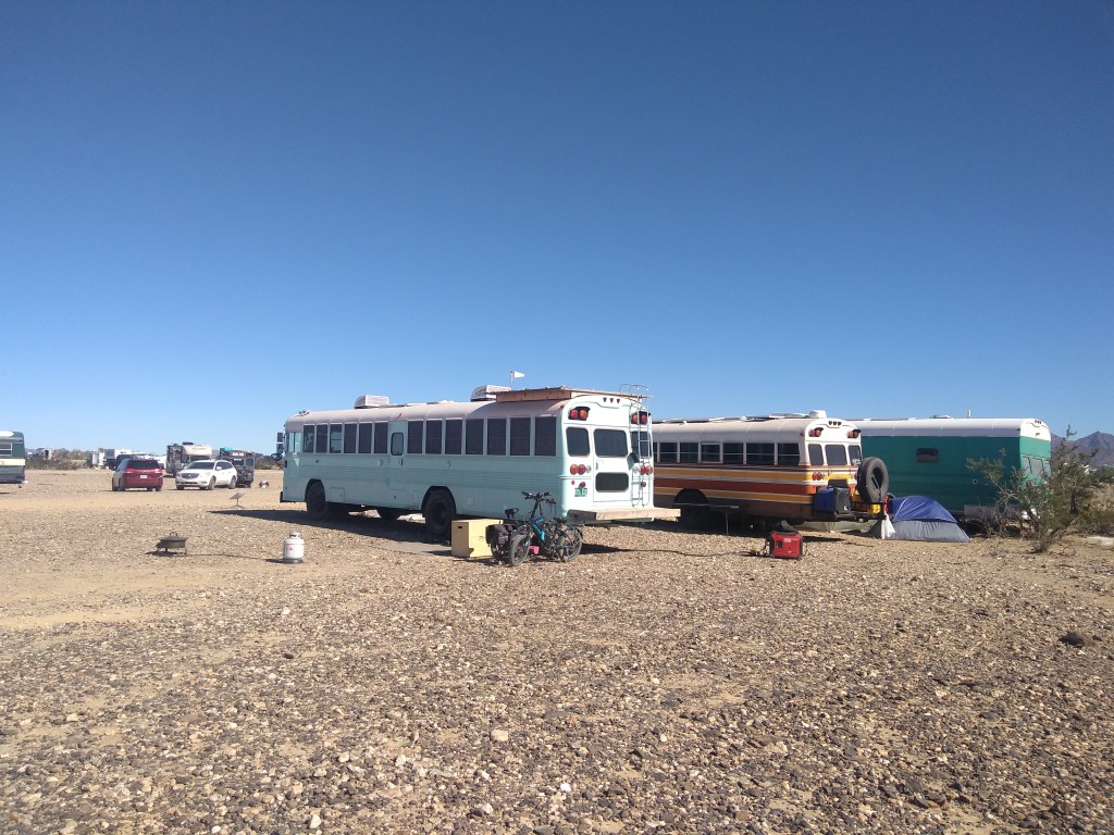 Ham fest was over a couple of days back. Yesterday we left Quartzsite, AZ and moved to Ehrenburg, AZ, where they have a different kind of fest known as Skooliepalooza. This is a place in the middle of the desert with 300 or so school bus campers (school buses that have been converted into campers) parked for a week of hanging out, mingling, selling little trinkets, music and visiting each other’s buses to see their conversions. If you think about it, its mind boggling. None of these buses are factory manufactured campers. Each has been converted by someone to make a living space. Some people live in these buses exclusively. Some, like us, are travelling for a short time. We arrived towards the end of Skooliepalooza but are enjoying the atmosphere.