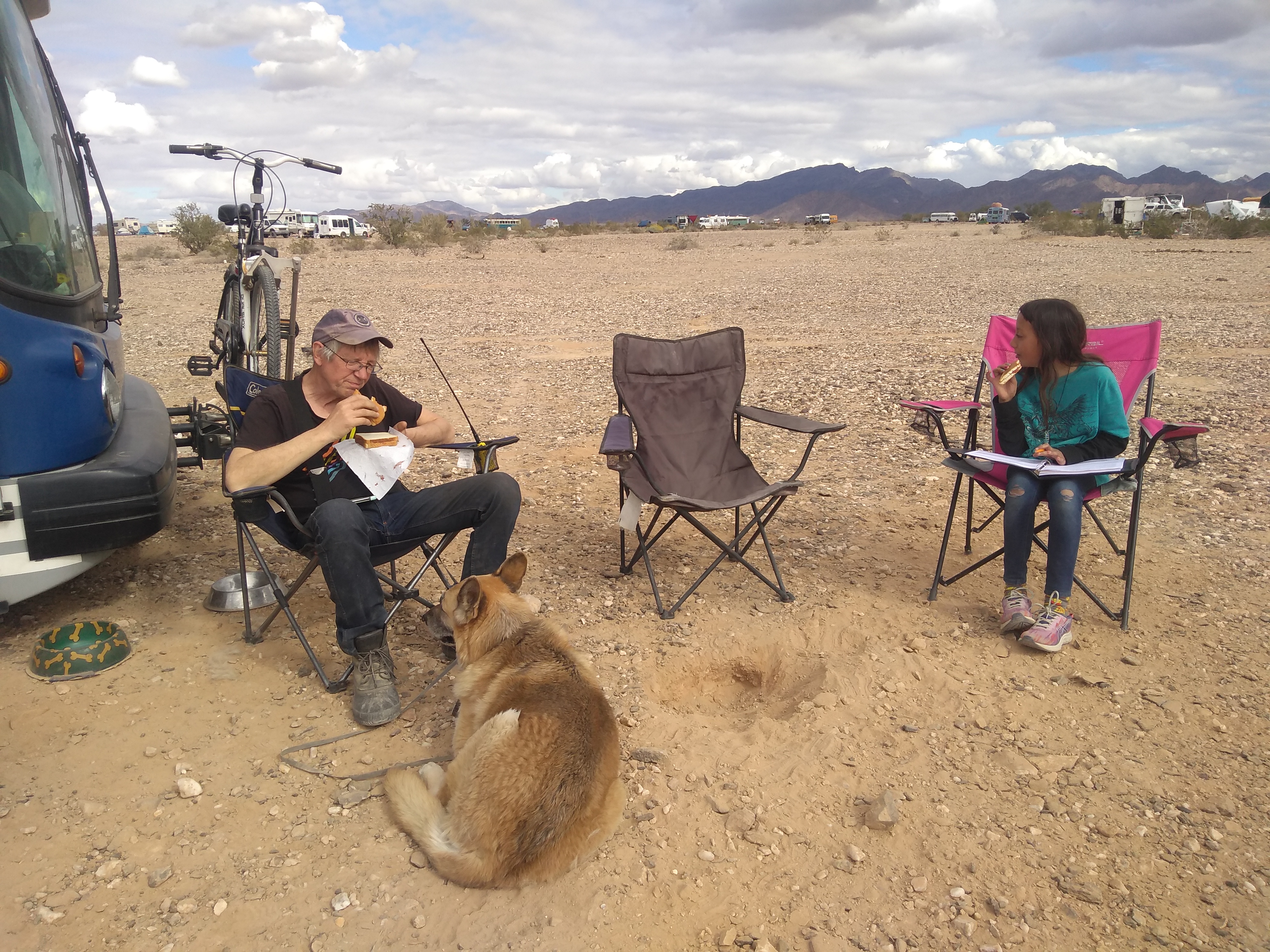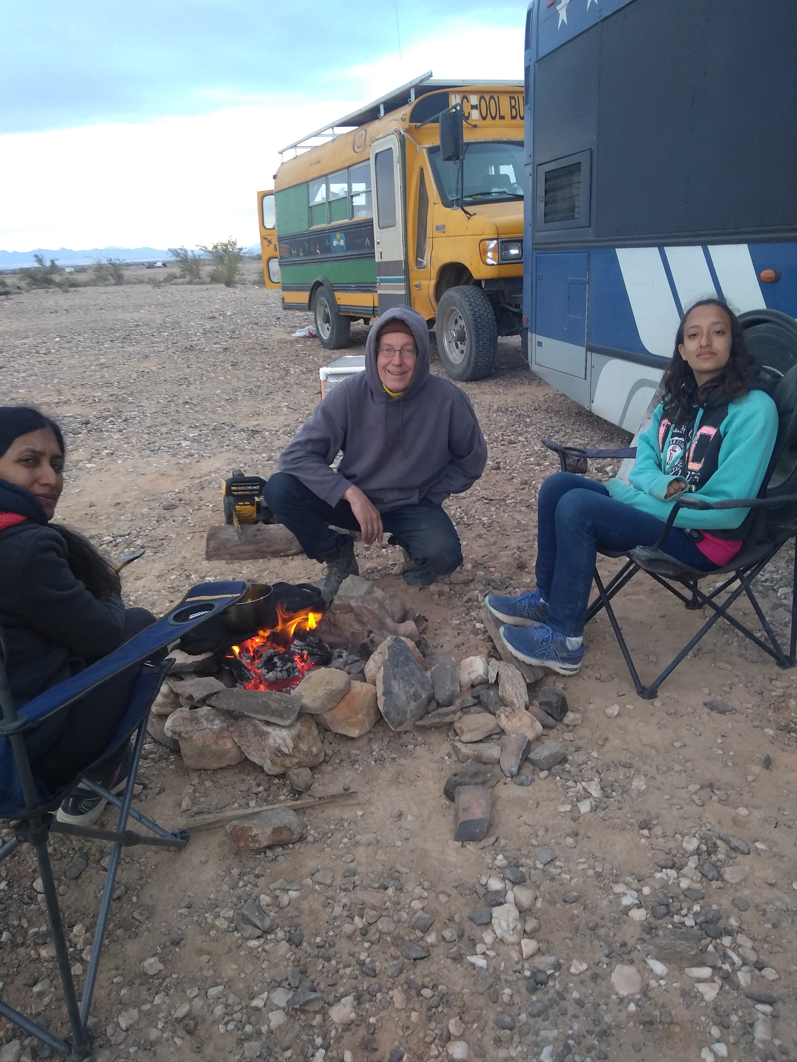 Ham fest was over a couple of days back. Yesterday we left Quartzsite, AZ and moved to Ehrenburg, AZ, where they have a different kind of fest known as Skooliepalooza. This is a place in the middle of the desert with 300 or so school bus campers (school buses that have been converted into campers) parked for a week of hanging out, mingling, selling little trinkets, music and visiting each other’s buses to see their conversions. If you think about it, its mind boggling. None of these buses are factory manufactured campers. Each has been converted by someone to make a living space. Some people live in these buses exclusively. Some, like us, are travelling for a short time. We arrived towards the end of Skooliepalooza but are enjoying the atmosphere.