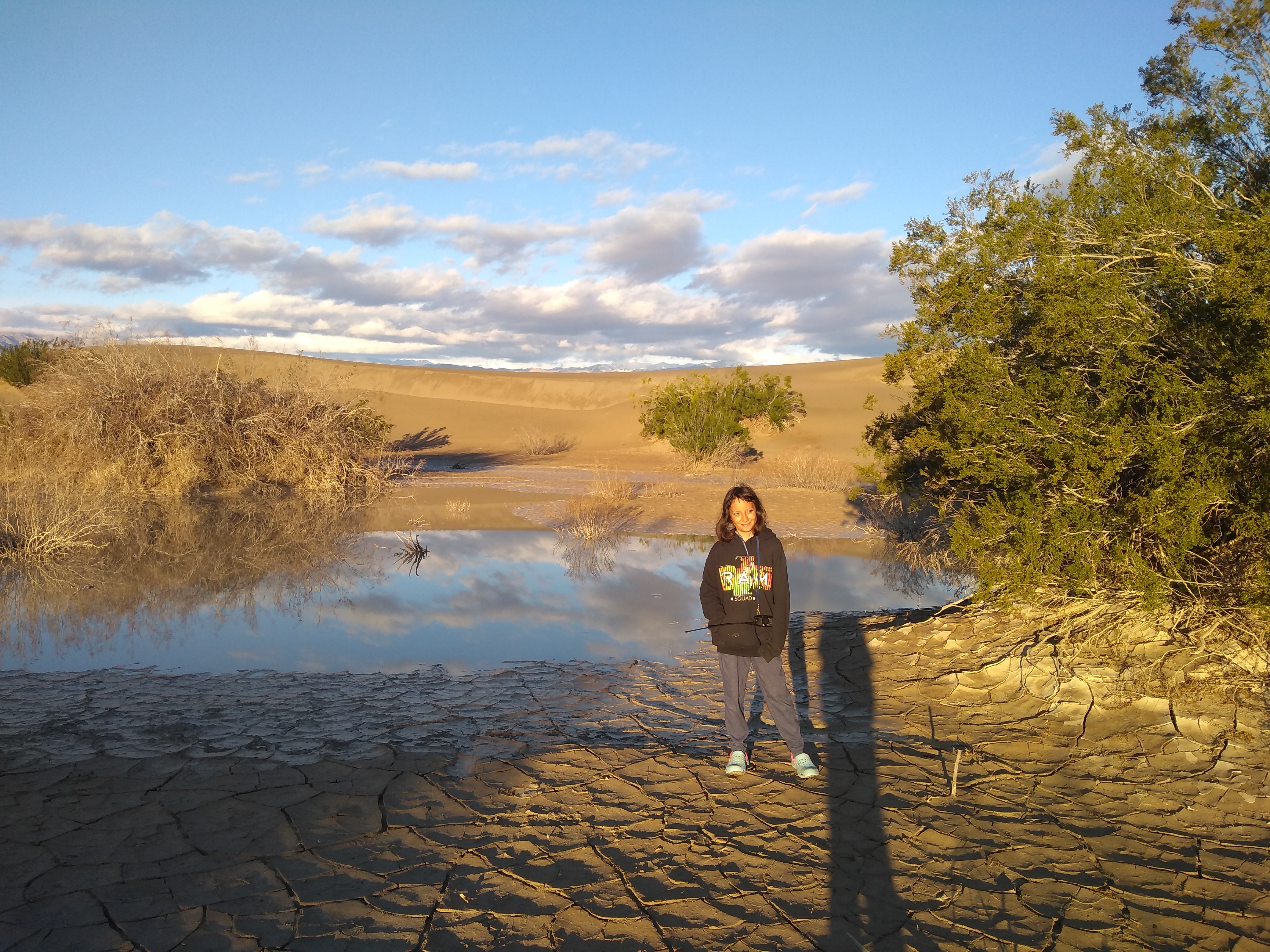 Still, it would have been fun to visit the Ubehebe Crater and racetrack, but alas, it wasn’t meant to be. The main road to Ubehebe crater was closed off. We did our junior ranger activities. From there we visited the Mesquite sand dunes. These are lovely. We spent the night there. In the morning I went for a walk over the dunes by myself. Leena joined me later and we had a fun time finding animal tracks on the dunes.