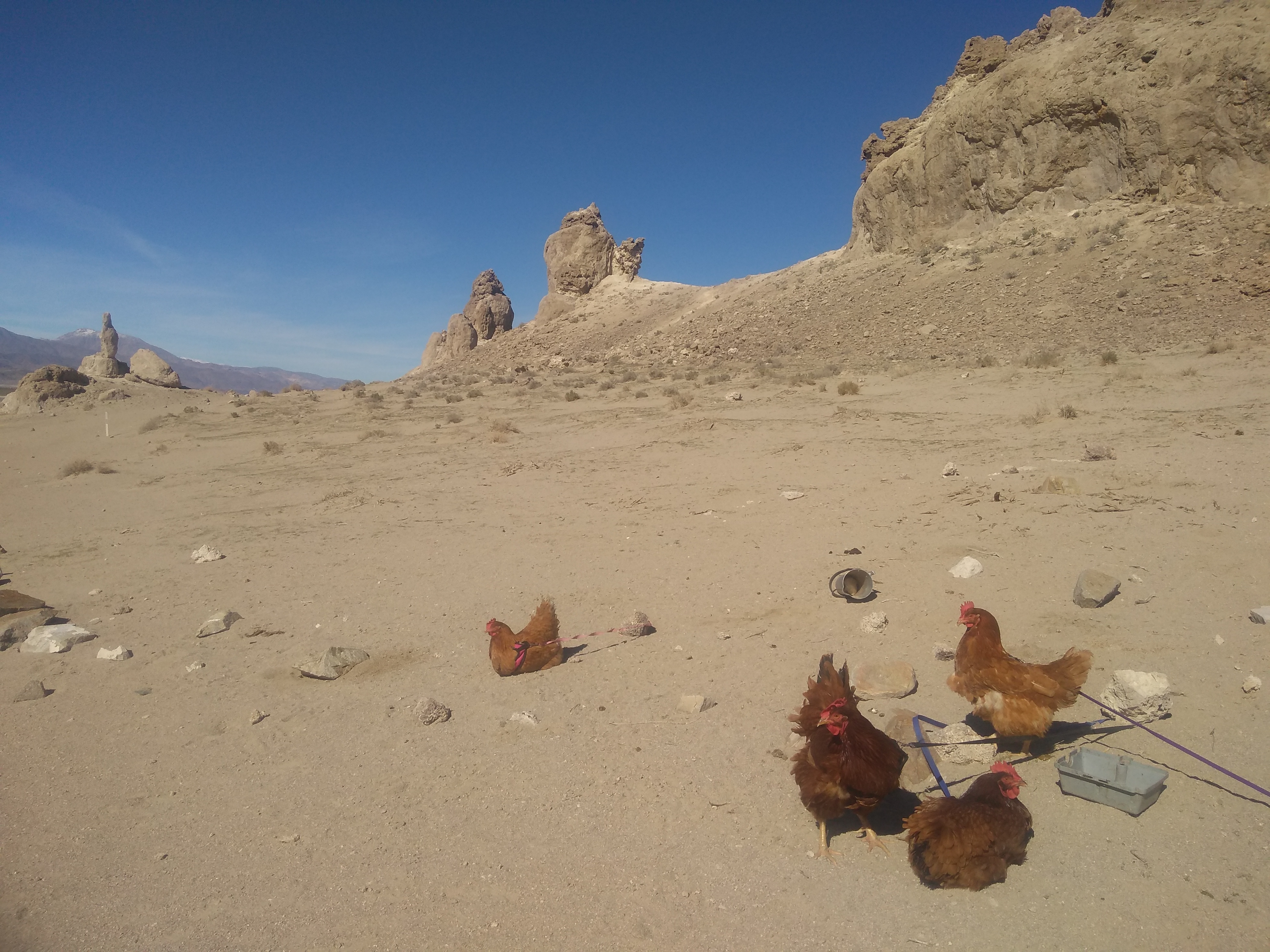 Crazy Cookie, the chicken: Hiya Kylo Ren. You stay away from me. Yes, my friends, Trona Pinnacles were fun. We got to free range. Lazy Laurie entered the big bus Dory. She was so assertive that Rosie the dog looked scared. Lazy Laurie is totally awesome (sigh!). Kylo Ren is a bit crazy. He tries to get to us and I don’t think it is to give us a lick of love. More like, the bite of death. Luckily the humans have been successful in keeping us separated so far. He did escape today but was caught on time.