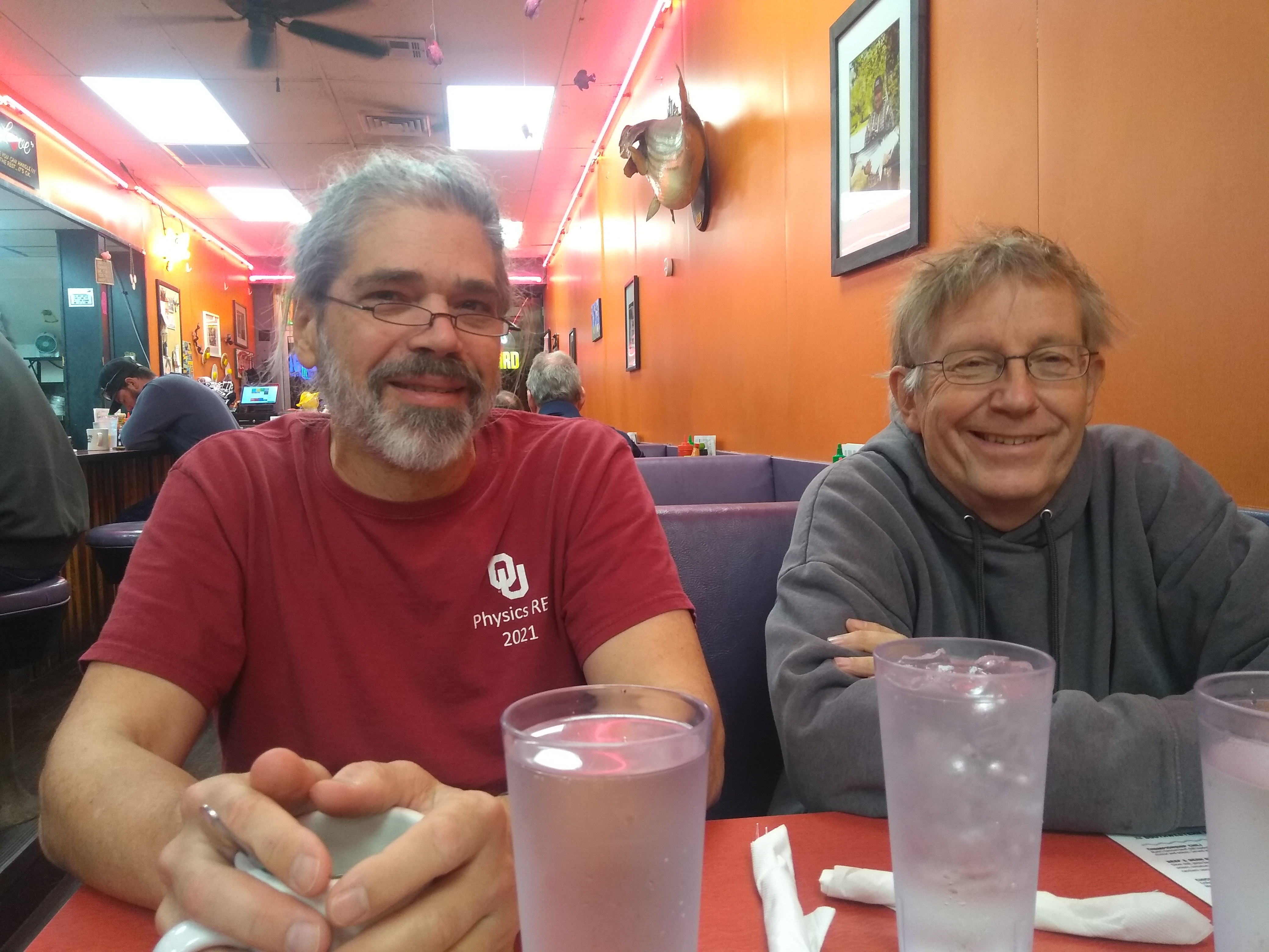 We parked by Lloyd’s place around 6 am. Lloyd was out to receive us. We all went for breakfast at a local diner. Once back, Johan and Lloyd went to his lab (Lloyd is a Physics Professor at the University of Oklahoma) to get the laser to work. Around 10 am, Tanya, Leena and I decided to walk over to the library which was a mile away. It was a fun walk and a lovely library. However, the storm came in, and we got stuck for many hours there. We read, researched and explored the library. We ran back when there was a slight break in the storm. That evening we went out for dinner at a nice, alternative style restaurant with Lloyd and his girlfriend Joyce. It was a fun time. However, when we got back, we discovered that Kylo had torn up one of our couches in rage at us disappearing for all these hours. Sigh. The redesigned couch is not overly uncomfortable, but definitely ugly!