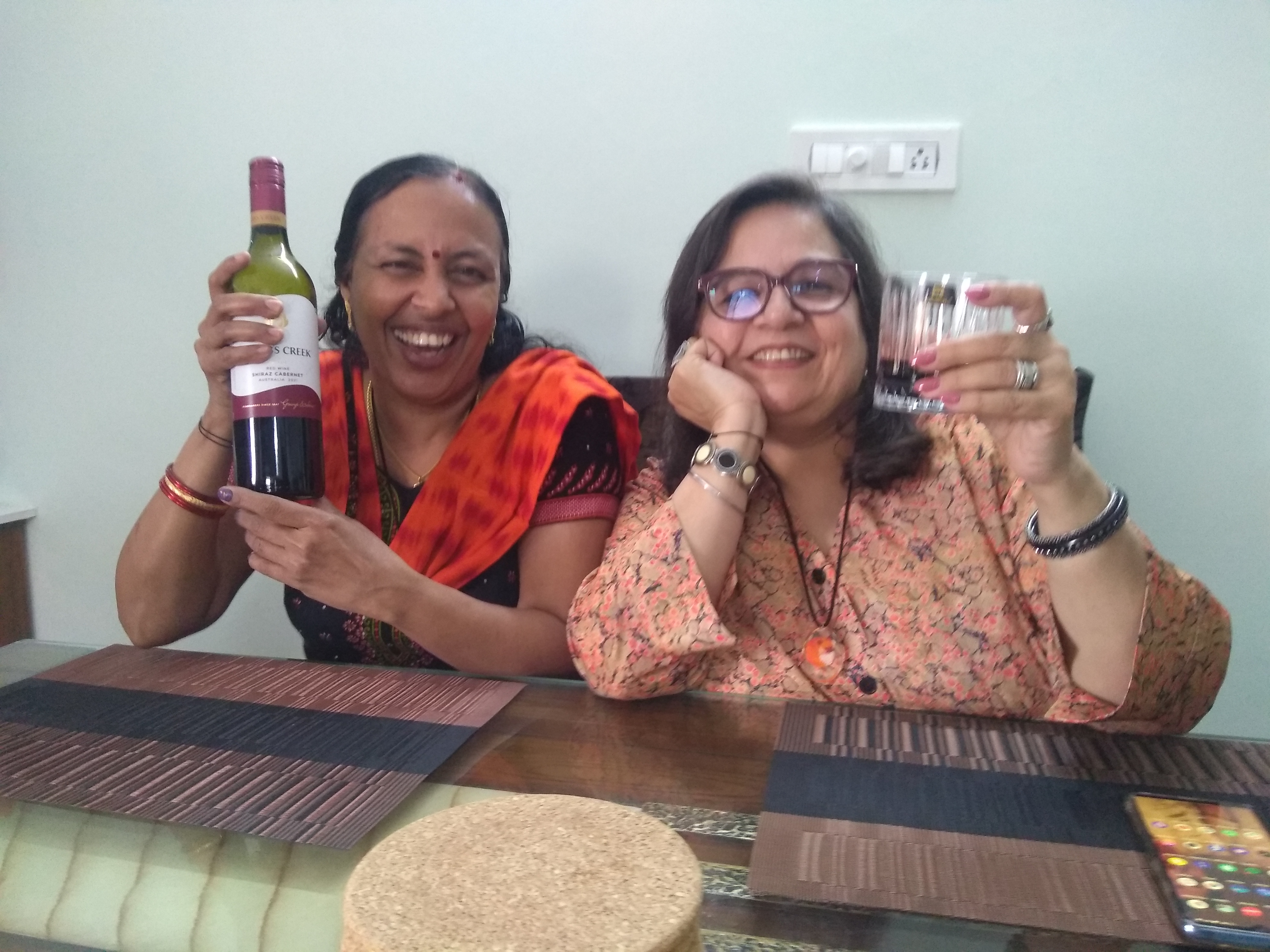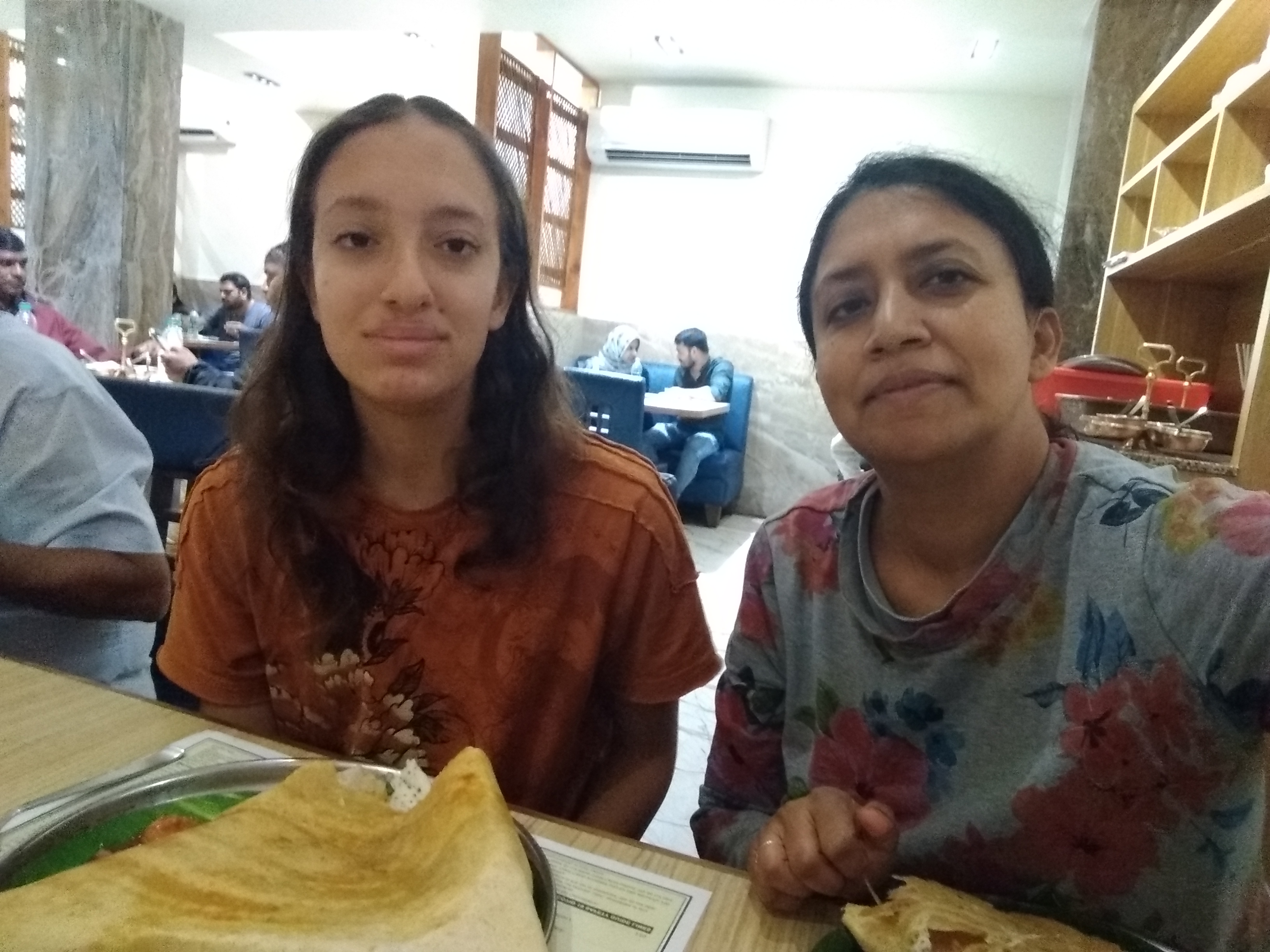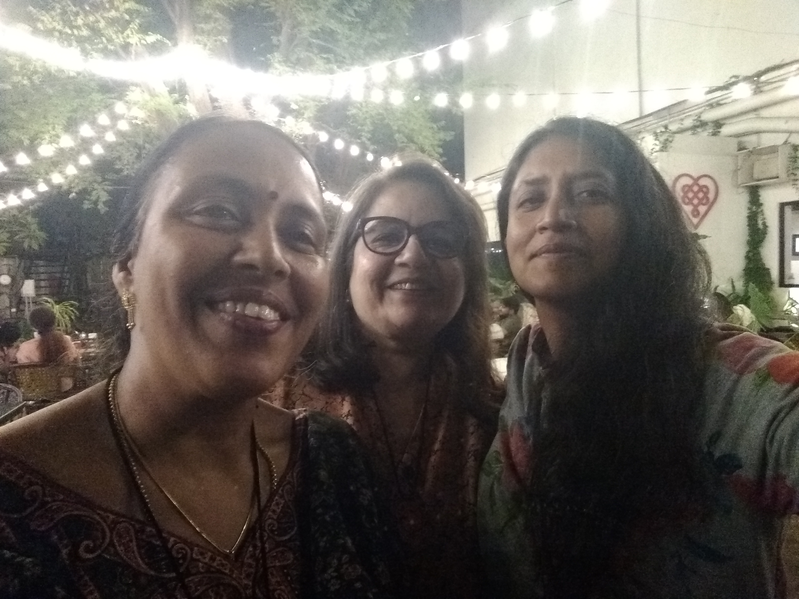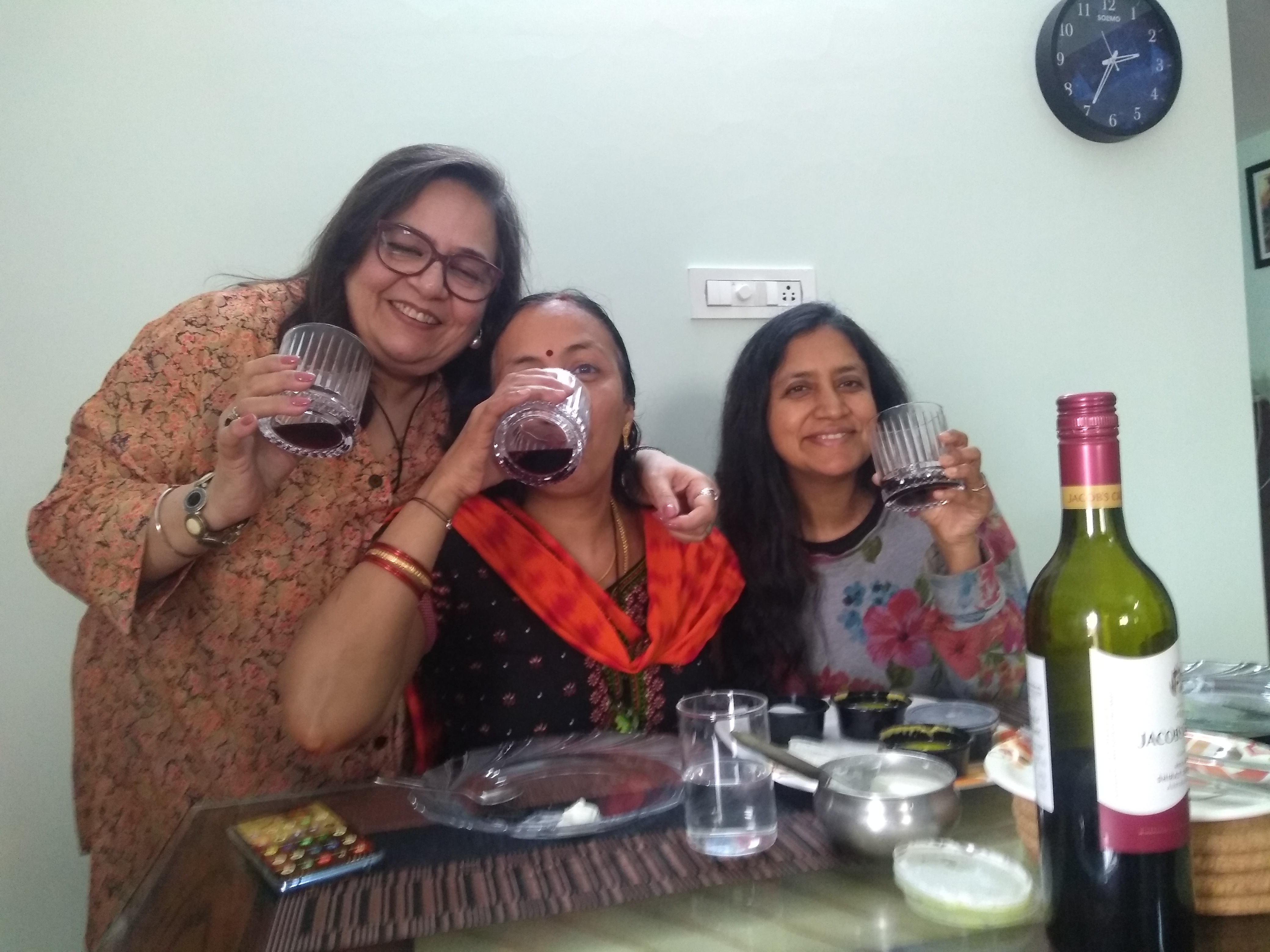 We ate Biryani and had some red wine and chai at Sreeja’s place. We just chatted, exchanged gifts and marveled at the strange circumstances that not only brought us together, but also made us sure that we would like each other. Around 5 pm, we took Sreeja and the cab back to Green Park. It was quite a long ride through parts of Hyderabad that I haven’t seen for a long time. We reached the hotel. The plan was for us three to stay in the room for the night. We opened Smule invites for our friends to join and then just chit chatted the evening away. Late at night we went downstairs to get some food. Interestingly, we ran into my old college mate and the hotel’s owner, Gautam, there.
