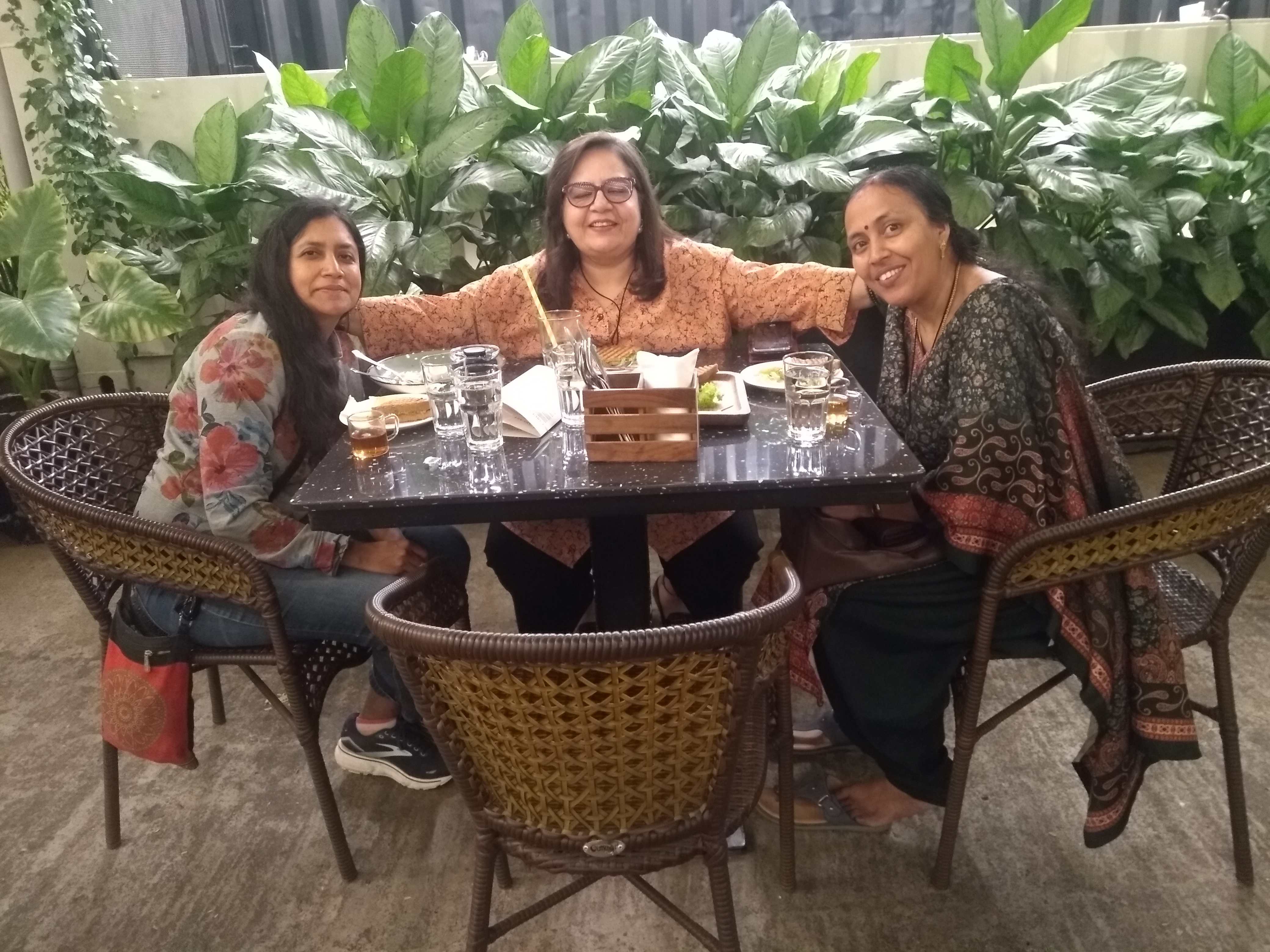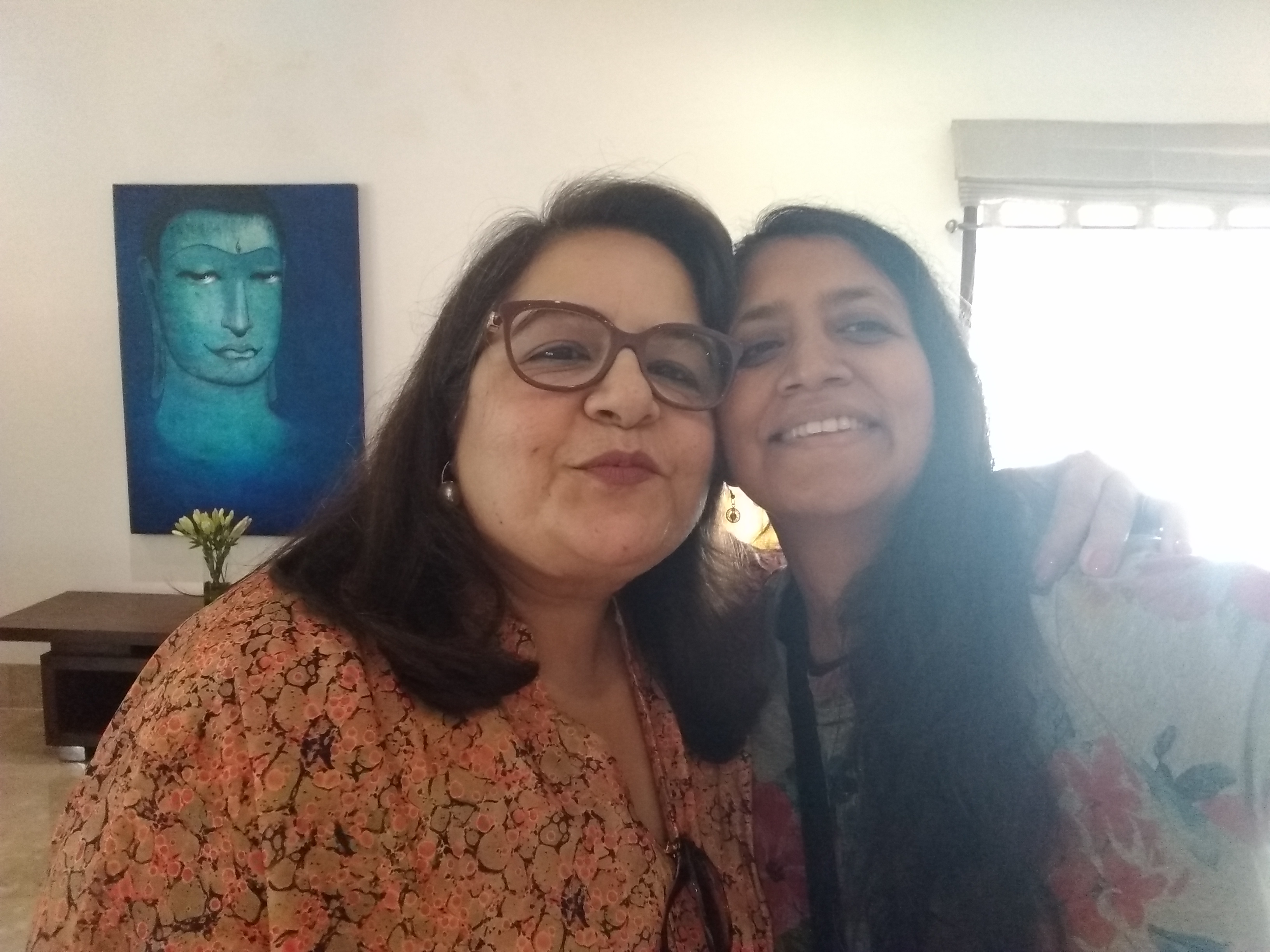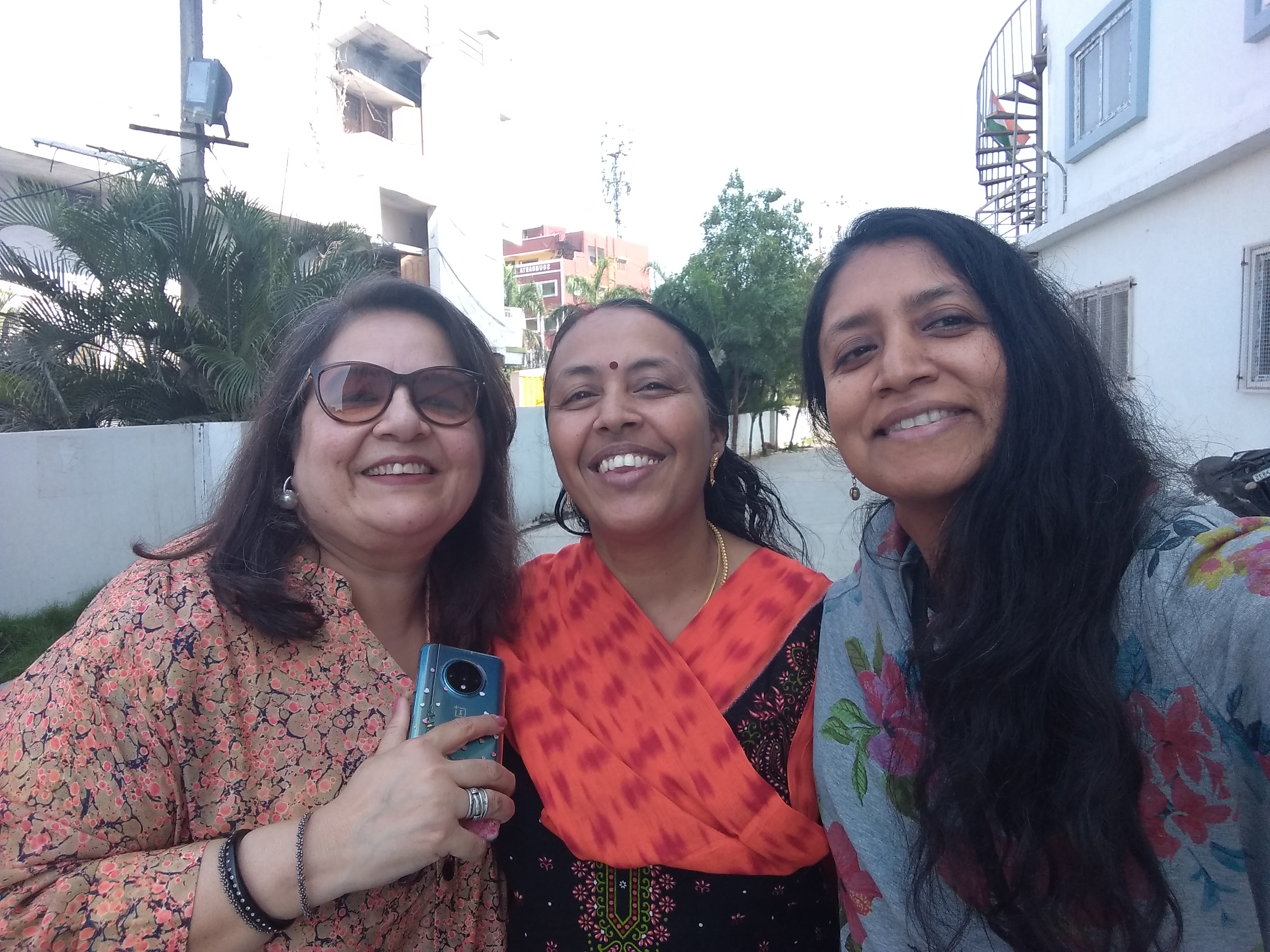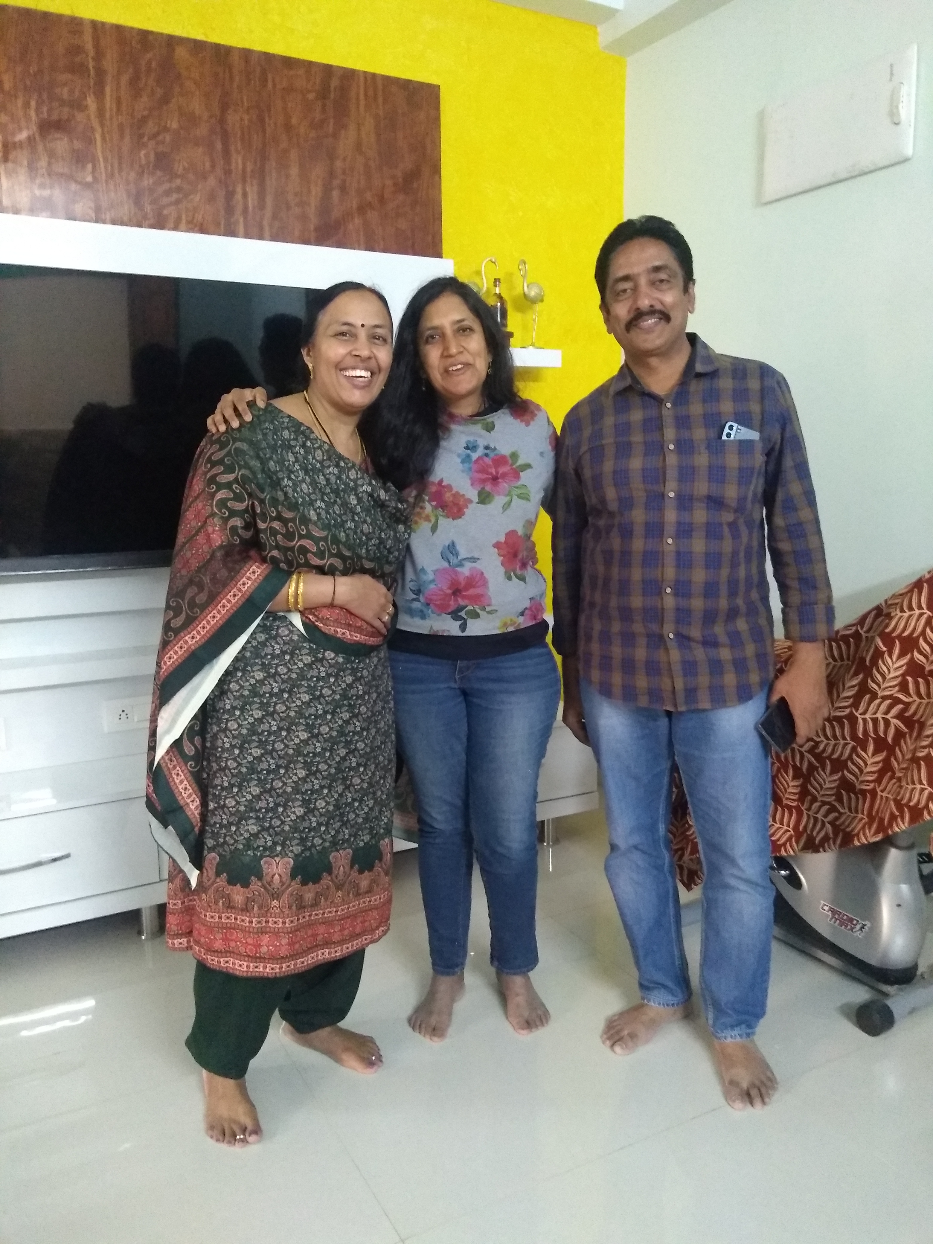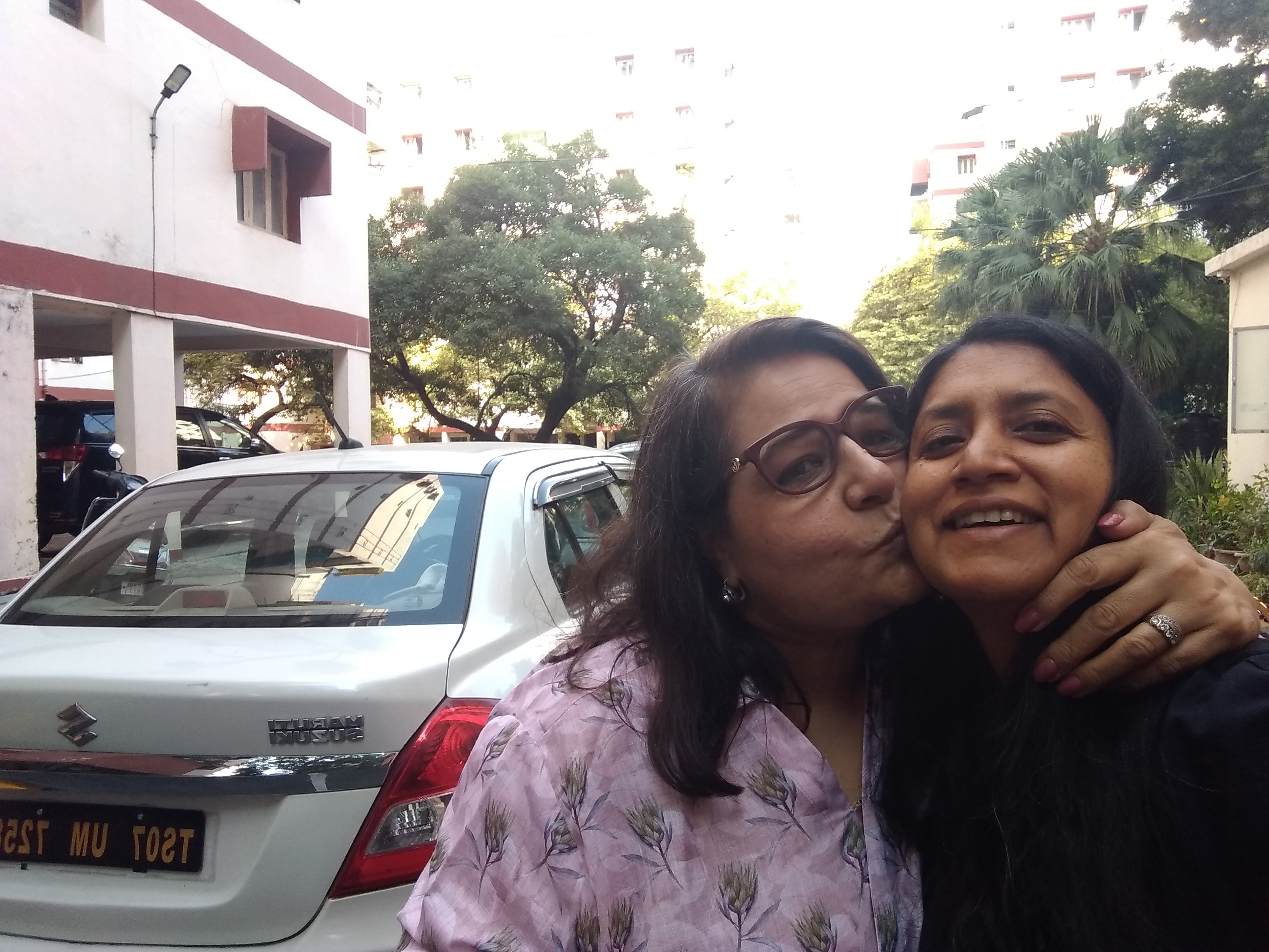 Monday was truly memorable. From the past year and a half, I have been friends with two awesome ladies, Vandy and Sreeja on the singing platform, Smule. Since I was visiting, Vandy, who lives in Delhi, flew in town. Sreeja conveniently lives in Hyderabad. Vandy was staying at a hotel near my parents’ house. So that morning my dad and the kids dropped me off at the hotel Green Park, where Vandy and I met for the first time. It was beyond exciting to meet her in flesh and blood! Sreeja’s husband had generously arranged for a cab for us. We got in the cab and it took us to Sreeja’s lovely apartment. There we got to see Sreeja for the first time. We have been sharing our lives with each other daily for the past year and a half, and we also sing together. This made for a strong connection and we were beyond thrilled to see each other and to be in each other’s company. We met Ravi and Tarun, Sreeja’s husband and son. The whole family was adorable, but Sreeja with her constant chatter definitely stole the show! Ravi and Tarun just sat back and took in the scene of three super excited ladies and their constant exclamations!