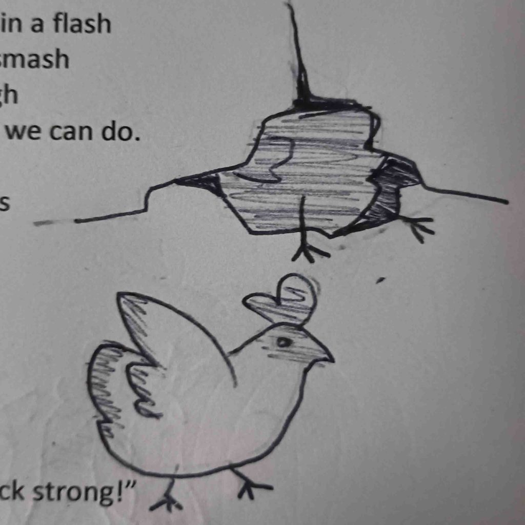 They look surprised! The chickens high-five.